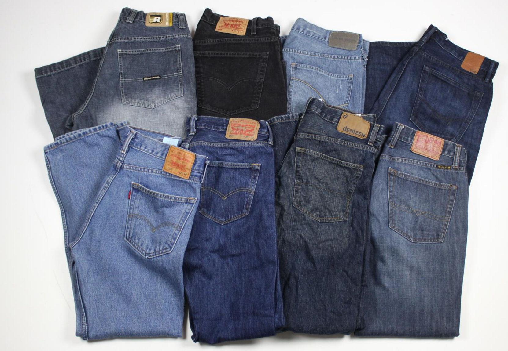 Our denim grade includes all sizes and all brands, and is a mixture of men, women and children together. We don't sort by gender, brand, or size. Jeans are 70% blue jeans and 20-30% varied colors. Sizes from 24"-40" waist with the average being 26"-34".